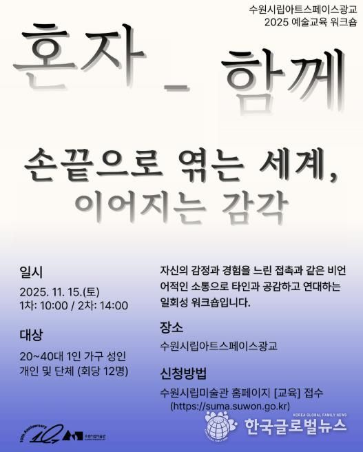 (한국글로벌뉴스 - 박소연 기자) 경기도 수원시립미술관은 예술을 통해 타인과의 관계를 확장하고 감각을 회복하는 예술교육 워크숍 '혼자-함께'를 11월 15일 수원시립아트스페이스광교에서 개최한다.