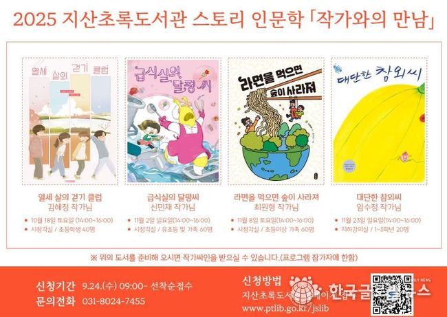 이번 프로그램은 전 세대가 함께 즐길 수 있는 독서 인문학의 장으로, 프로그램 관련 문의는 지산초록도서관(031-8024-7455)으로 가능하다. (사전접수 마감) 도서관 관계자는 “지역 어린이들이 작가와의 만남을 통해 책의 세계를 한층 깊이 느끼고 창의적인 영감을 얻는 계기가 되길 바란다”라고 전했다.
