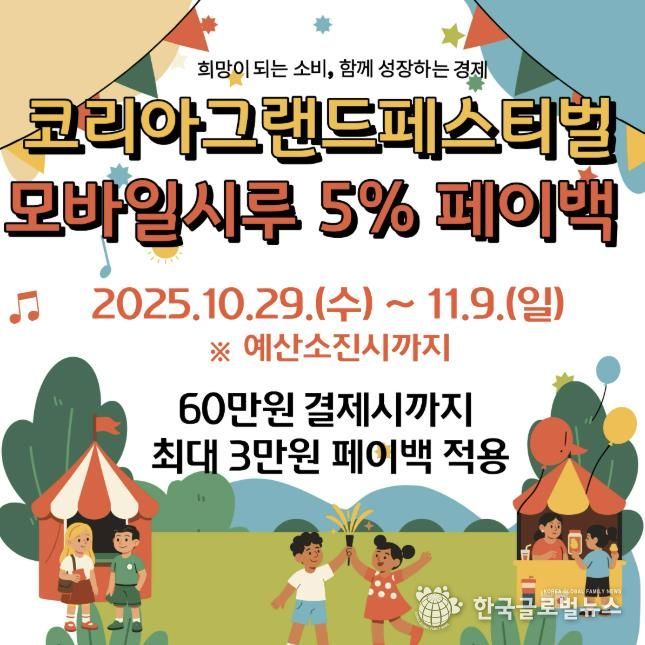 (한국글로벌뉴스 - 박소연 기자) 시흥시는 오는 10월 29일부터 11월 9일까지 12일간 정부가 추진하는 ‘코리아 그랜드 페스티벌’에 참여해 시흥화폐 ‘시루’ 모바일결제 시 5%를 돌려주는 환급행사인 페이백을 진행한다. 이를 통해 시민들의 소비를 촉진하고 지역경제에 활력을 불어넣을 계획이다.