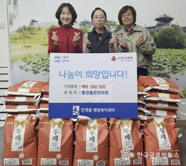 (한국글로벌뉴스 - 박소연 기자) 지난 10월 22일, 통영돌문어보쌈에서 인계동 행정복지센터에 백미 10kg 50포를 전달했다.