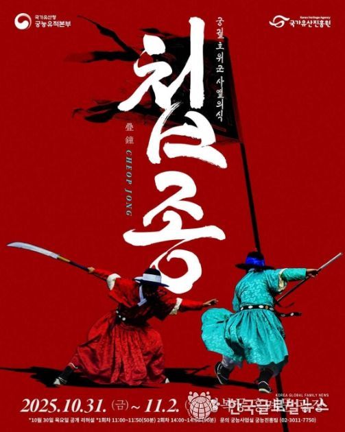 (한국글로벌뉴스 - 박소연 기자) 국가유산청 궁능유적본부는 국가유산진흥원과 함께 10월 31일부터 11월 2일까지 하루 2회(오전 11시, 오후 2시) 경복궁(서울 종로구) 흥례문 광장에서 '2025년 궁궐 호위군 사열의식 ‘첩종(疊鐘)’' 행사를 개최한다.