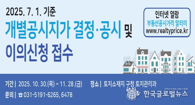 (한국글로벌뉴스 - 박소연 기자) 수원시 권선구는 다가오는 30일에 개별공시지가를 결정·공시하고 10월 30일부터 11월 28일까지 이의신청을 받는다.