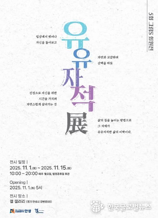 (한국글로벌뉴스 - 박소연 기자) 안성천 우리동네 작은미술관 결갤러리에서는 오는 11월 1일부터 15일까지 그림스아뜰리에 제5회 회원전 ‘유유자적’이 열린다. 이번 전시는 바쁜 일상 속에서 잠시 걸음을 멈추고, 자연과 교감하듯 마음을 산책하는 여유의 시간을 주제로 마련됐다.