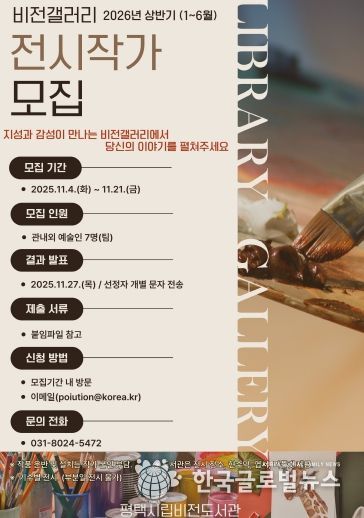 (한국글로벌뉴스 - 박소연 기자) 평택시립 비전도서관에서는 관내․외 예술가와 신진 작가에게 폭넓은 전시 기회를 제공하고, 시민들이 예술을 보다 가까이에서 누릴 수 있는 기회를 제공하고자 오는 11월 4일부터 21일까지 2026년 상반기 비전갤러리 전시 작가를 모집한다.