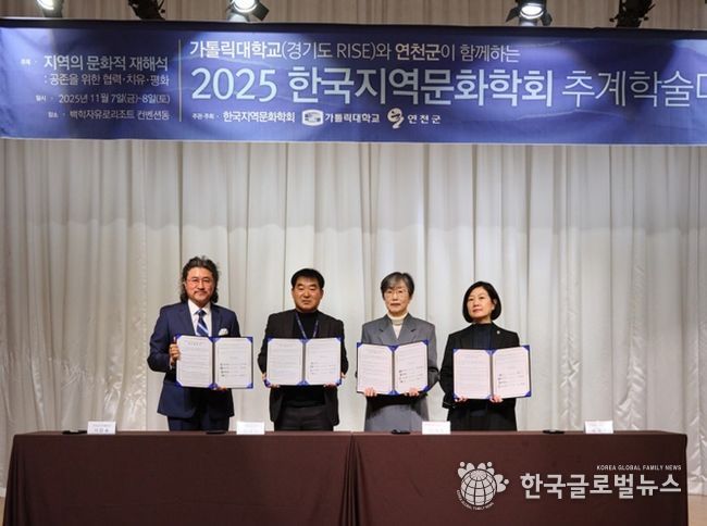 (한국글로벌뉴스 - 박소연 기자) 경기문화재단 전곡선사박물관은 지난 7일 백학자유로리조트 컨벤션센터에서 연천군, 가톨릭대학교, 한국지역문화학회와 경기도 RISE 사업과 연계한 ’경기북부 지역혁신 네트워크 구축‘ 업무협약(MOU)을 체결했다.