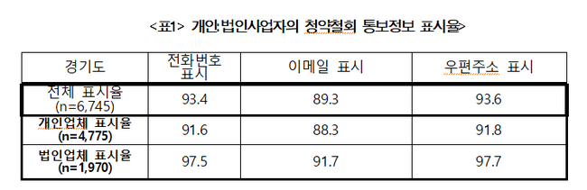 조사 결과, 전화번호·이메일·우편주소 등 청약철회 통보를 위한 기본 연락처 표시율은 전체적으로는 비교적 양호했으나, 개인사업자의 표시율은 법인사업자보다 낮았다. 특히 개인사업자의 경우 전화번호(91.6%), 이메일(88.3%), 우편주소(91.8%) 모두 법인사업자에 비해 뒤처진 것으로 나타났다.