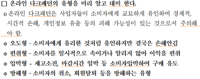 한편 경소협은 소비자들에게도 “과도한 할인, 재고 소진 임박 등 구매를 압박하는 표현이나, 평소와 다른 과도한 디자인·문구를 접할 경우 다크패턴을 의심하고 거래를 중단해야 한다”며 주의를 당부했다.