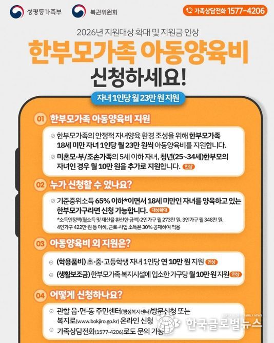 (한국글로벌뉴스 - 박경희 기자) 2026년 지원대상 확대 및 지원금 인상