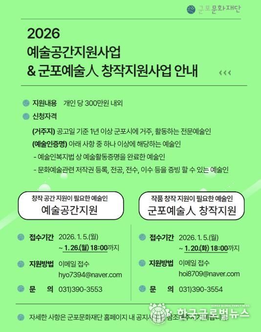 (한국글로벌뉴스 - 박소연 기자) 군포문화재단은 군포시에서 활동하는 전문예술인을 대상으로 예술인 지원사업 공모를 시작한다고 밝혔다. 예술인의 안정적인 창작환경 조성과 창작활동 활성화를 위한 ▲예술공간지원사업과 신규 창작 작품 및 프로그램 제작을 지원하는 ▲군포예술人 창작지원사업이 두 개의 개별 사업으로 운영된다.