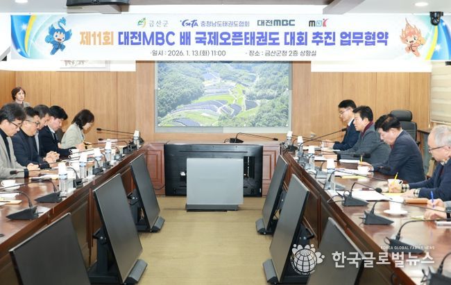 (한국글로벌뉴스 - 박지형 기자) 금산군은 지난 13일 군청 2층 상황실에서 제11회 대전엠비씨(MBC)배 국제오픈태권도대회 유치를 위해 대전엠비씨(MBC), 충남태권도협회, 엠비씨(MBC)국제오픈태권도조직위원회와 업무협약을 체결했다.
