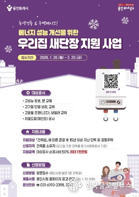 (한국글로벌뉴스 - 박소연 기자) 용인특례시가 오는 26일부터 2월 20일까지 노후주택 에너지 효율 개선 지원 사업인 ‘우리집 새단장 지원사업’ 신청을 받는다고 16일 밝혔다.