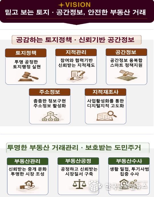 추진계획은 ▲투명하고 균형 잡힌 제도 운영으로 신뢰받는 토지행정 실현 ▲참여와 협력을 통한 신뢰받는 지적제도 정착 ▲공간정보 융·복합을 통한 스마트한 정책 지원 ▲촘촘한 주소정보 구현 및 주소정보 활성화 추진 ▲사업활성화를 통한 디지털지적 고도화 ▲신뢰받는 중개 문화와 투명한 부동산 시장 조성 ▲공정하고 신뢰받는 시장질서 구축 ▲생활밀접, 투기사범 집중수사 등 8대 전략을 바탕으로 한 92개 세부 이행과제로 구성됐다.