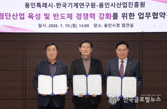 (한국글로벌뉴스 - 박소연 기자) 용인특례시는 19일 시청 접견실에서 한국기계연구원(KIMM), 용인시산업진흥원과 ‘첨단산업 육성 및 반도체 경쟁력 강화를 위한 업무협약’을 체결했다.