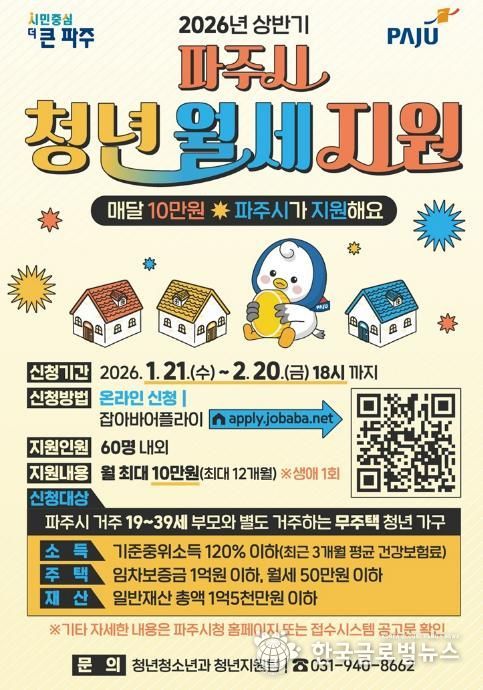 (한국글로벌뉴스 - 박종욱 기자) 파주시는 주거비 부담으로 어려움을 겪고 있는 19~39세 청년 가구를 대상으로 월 최대 10만 원씩 최대 12개월간, 총 120만 원의 월세를 지원한다.
