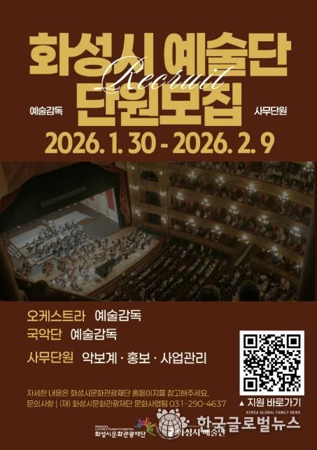 (한국글로벌뉴스 - 박소연 기자) (재)화성시문화관광재단은 2026년 ‘화성시 예술단’을 이끌어갈 예술감독과 사무단원을 모집한다.