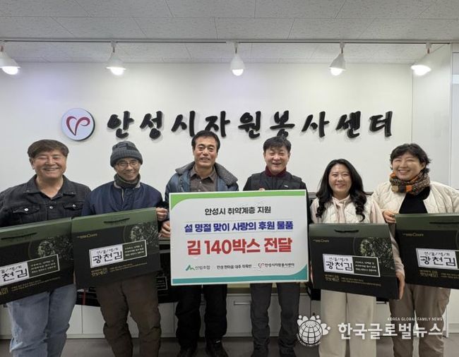 (한국글로벌뉴스 - 박소연 기자) 안성시자원봉사센터는 지난 12일, 안성한마음대추작목반으로부터 설 명절을 맞아 관내 어려운 이웃을 위한 김 140세트를 전달받았다.