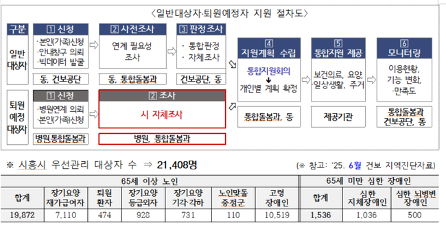시는 대상자를 지역 조사 등을 통해 발굴한 일반 대상자 병원 퇴원 시점에 돌봄을 연계하는 퇴원 예정 대상자로 구분해 보다 적극적인 맞춤형 돌봄 서비스를 제공할 예정이다.