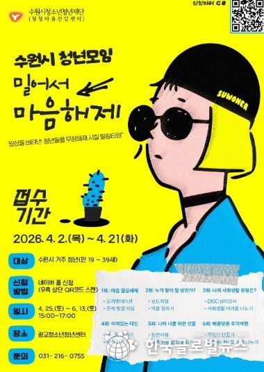 (한국글로벌뉴스 - 박소연 기자) 수원시청소년청년재단 청청마음건강센터는 사회적 관계 맺기에 어려움을 느끼거나 정서적 소진을 경험하는 지역 청년들을 위해 청년 자조모임 '밀어서 마음해제' 참여자를 모집한다.