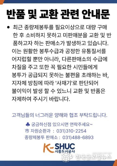 (한국글로벌뉴스 - 박소연 기자) 시흥시는 종량제봉투 공급이 안정화되면서 관내 일부 판매소를 중심으로 재고 조정을 위한 반품 요청이 증가하고 있다고 3일 밝혔다.