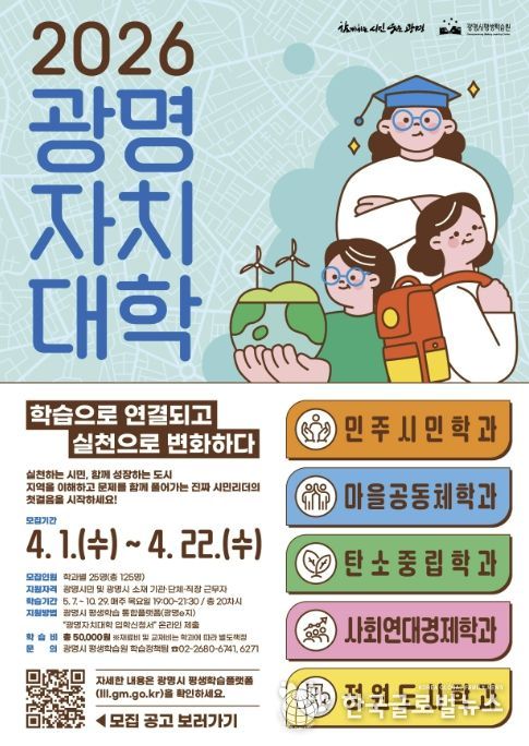 (한국글로벌뉴스 - 박소연 기자) 광명시가 시의 핵심의제인 평생학습 마을리더 양성과정 ‘광명자치대학’ 2026년 신입생 125명을 오는 22일까지 모집한다.