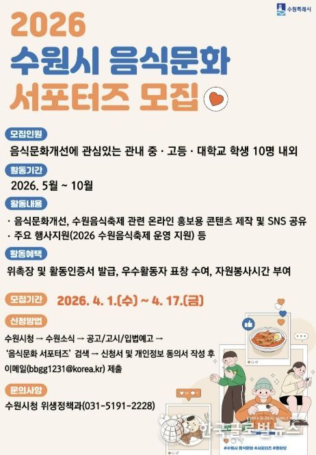 (한국글로벌뉴스 - 박소연 기자) 수원특례시는 ‘2026년 음식문화 서포터즈’로 활동할 중·고등·대학생을 4월 17일까지 모집한다.