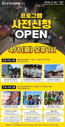 모집은 오는 6일 오후 1시부터 선착순으로 진행되며, 어린이와 성인 등 누구나 참여할 수 있다. 사전 모집 프로그램 중 ‘남도의례음식장과 함께하는 흑백미식가’, ‘지식가이드 투어’, 광주야행 숙박패키지 ‘세 개의 밤’은 유료로 운영되며, ‘광주읍성 체험극 사또의 하루’, ‘벽돌 미니어처 만들기’, ‘어린이 해설사 투어’, ‘서석초 옛날 교실 체험’ 등은 무료로 진행된다. 이 가운데 총 12개 프로그램이 사전 신청 대상으로 마련됐다.