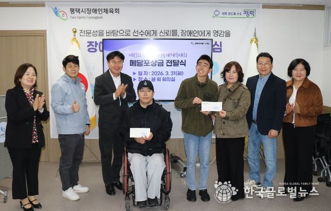 (한국글로벌뉴스 - 박지형 기자) 평택시장애인체육회는 지난 1일 강원특별자치도 일원에서 개최된 ‘제23회 전국장애인동계체육대회’에서 우수한 성적으로 시의 위상을 높인 선수들을 대상으로 메달 포상금 전달식을 진행했다.