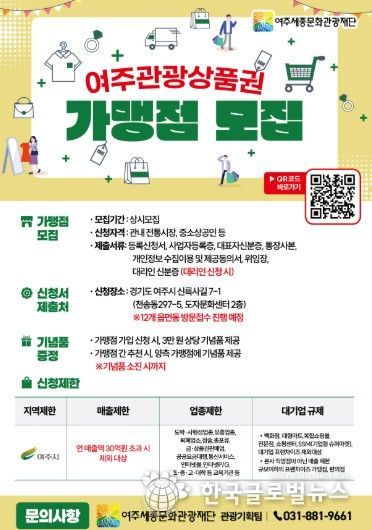 (한국글로벌뉴스 - 김정현 기자) 여주시는 관광객 유입 증가에 따른 지역 내 소비 활성화를 위해 추진 중인 ‘여주관광상품권’ 가맹점을 확대하고자 읍․면․동 현장 접수를 본격 실시한다고 밝혔다.