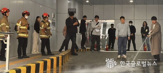 훈련은 화재 발생 시 행동 요령 교육을 시작으로 ▲연기 발생 상황을 가정한 대피 훈련 ▲교육용 소화기 사용 실습 ▲옥내 소화전 살수 실습 순으로 진행됐으며, 참가자들은 실제 화재 상황에 대비한 대응 능력을 체득했다.