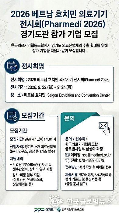 (한국글로벌뉴스 - 박소연 기자) 경기도가 도내 의료산업체 해외 진출 지원을 위해 ‘2026년 베트남 호치민 의료기기 전시회(Pharmedi 2026)’에 참여할 기업을 오는 15일까지 모집한다.