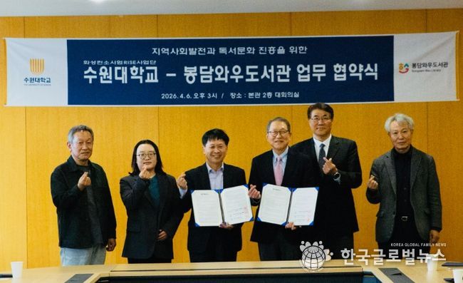 (한국글로벌뉴스 - 박소연 기자) (재)화성시문화관광재단(대표이사 안필연) 봉담와우도서관과 수원대학교는 지난 4월 6일 수원대학교 본관 대회의실에서 지역발전과 독서문화 진흥을 위한 업무협약(MOU)을 체결했다.