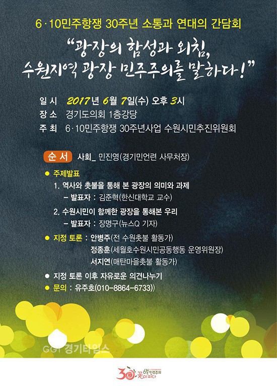 이번 간담회는 6.10민주항쟁 30주년사업 수원시민추진위원회가 주최한다. 주제는 “광장의 함성과 외침, 수원지역 광장 민주주의를 말하다!”이다.