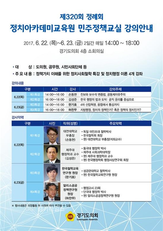양근서 의원(더민주, 안산6) 도의회 제3연정위원장도 도의원 중심 의정교육인 정치아카데미교육을 확대발전시켜 도의원, 공무원은 물론 시민사회단체와 일반 도민 누구나 청강할 수 있는 민주정책교실을 제320회 정례회 기간 중에 연다고 했다.
