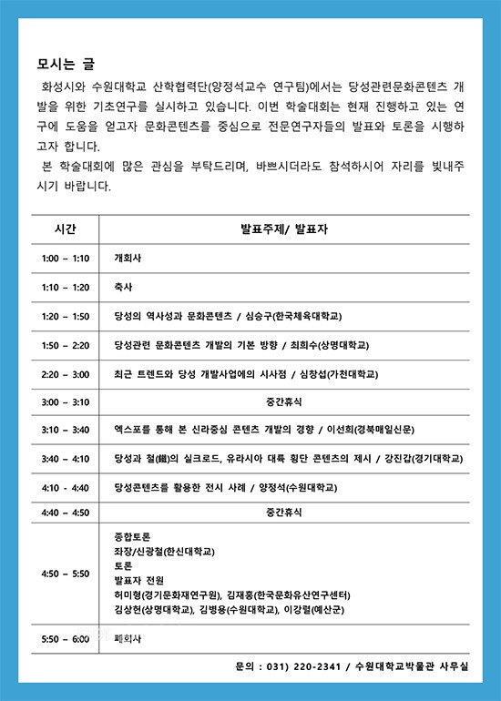 학술대회는 6개의 주제로 ▲당성의 역사성과 문화콘텐츠(심승구 한국체대 교양학부 교수) ▲당성관련 문화콘텐츠 개발의 기본 방향(최희수 상명대 역사문화콘텐츠학과 교수) ▲최근 트렌드 분석을 통해 본 당성 중심 관광개발(심창섭 가천대 관광경영학과 교수) ▲당성과 철(鐵)의 실크로드, 유라시아 대륙 횡단 콘텐츠의 제시(강진갑 경기대 교양학부 교수) ▲엑스포를 통해 본 신라 중심 콘텐츠 개발의 경향(이선희 경북매일신문 기획전략본부장) ▲당성 콘텐츠를 활용한 전시 사례(양정석 수원대 박물관장)가 발표된다.