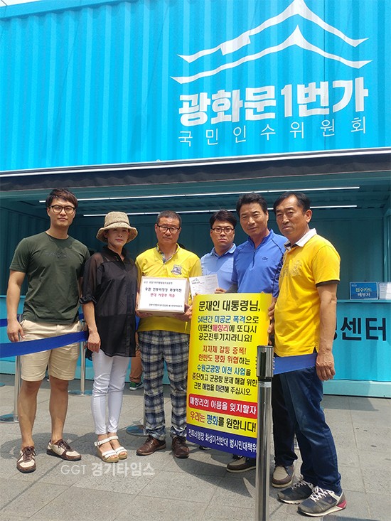 [경기타임스] 전투비행장 화성이전반대 범시민대책위원회가 12일 ‘광화문1번가’ 국민정책제안 접수 종료일에 맞춰 ‘수원전투비행장 화성이전 중단’요구를 담은 시민 서명부를 국정기획자문위원회와 국방부에 제출했다.