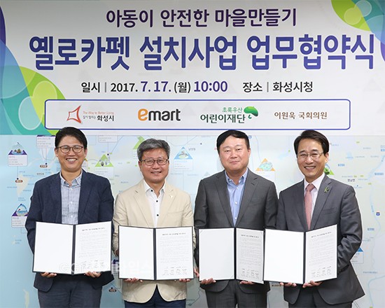 시는 ㈜이마트, 초록우산어린이재단과 ‘아동이 안전한 마을만들기’ 옐로카펫 설치사업 업무협약을 체결했다.