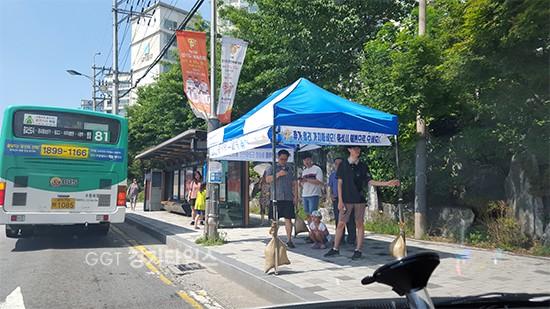 시는 나무그늘이 없는 버스정류장 옆, 횡단보도, 교통섬 등을 중심으로 천막 형태의 그늘막 쉼터 40개소를 지난달 말 설치 완료했다.