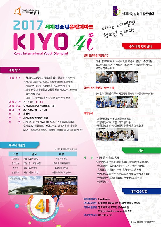 [경기타임스]화성시 정남면 수원과학대학교 신텍스홀에서 2017년 세계청소년 올림피아드 대회(KIYO 4I)가 11일 개막식을 갖는다.