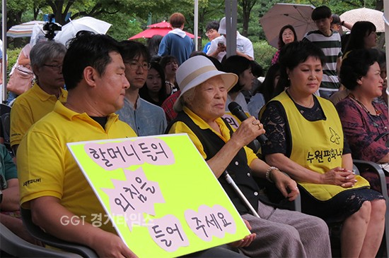 수원시 올림픽공원 광장에서는 14일 오전 11시세계 일본군 위안부 기림일을 맞아 수원에 사는 안점순 위안부 피해 할머니를 비롯해 시민과 청소년 등 200여 명이 참석해 일본의 진심 어린 사과와 배상을 촉구했다.