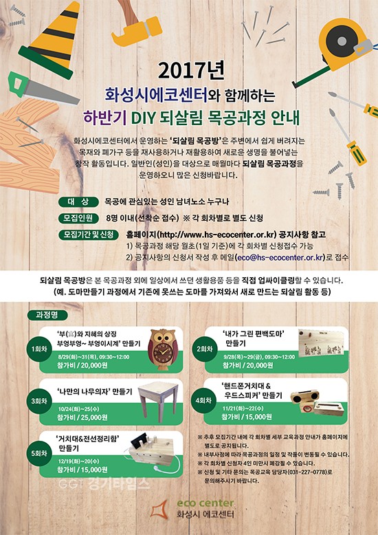 [경기타임스]화성시에코센터는 목재와 폐가구 등에 새로운 생명을 불어넣는 목공교실교육을 29일부터 운영한다고 23일 밝혔다.