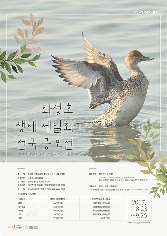 이번‘화성호 생태 세밀화 전국 공모전’은 화성시와 화성시의회가 주최하고 화성시생태관광협동조합이 주관하며 공모전에 대한 자세한 내용은 화성시생태관광협동조합 홈페이지(www.hsecotour.co.kr)에서 확인할 수 있다.