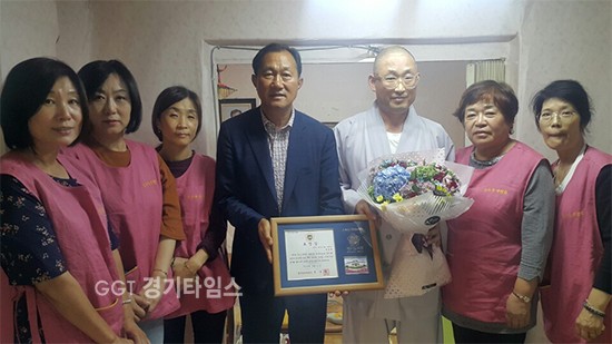 [경기타임스]경기도의회는 염동식(바른정당 평택시3) 부의장이 지난 17일 평택시 안중읍 모처에서, 오랜 기간 봉사회원들과 함께 독거노인 삶의 질 개선에 온 힘을 기울여 온 법진스님을 만나 표창장을 전달하였다고 밝혔다.