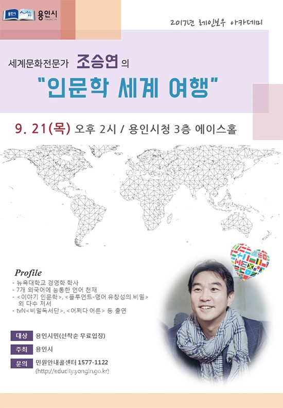 [경기타임스]용인시는 21일 시청에이스홀에서 세계문화전문가 조승연 작가를 초청‘레인보우아카데미’의 특강을 개최한다고 19일 밝혔다.