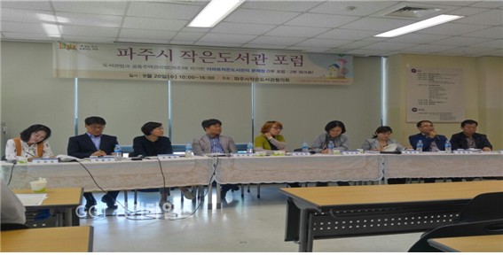 박미진 파주시작은도서관협의회 회장, 박용수 경기도의원, 손희정 파주시의원, 오인택 파주시 주택과 공동주택관리팀장, 오혜자 청주 초롱이네도서관 관장, 윤명희 중앙도서관 관장, 임봉성 파주시 교육지원과 도서관정책팀장이 토론자로 나섰다.
