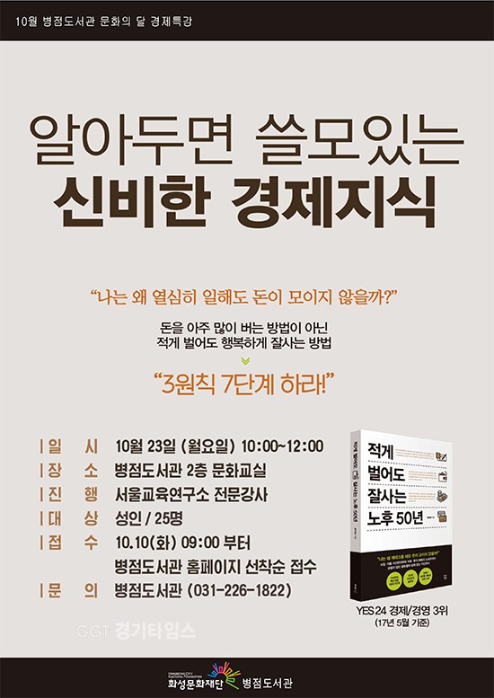 [경기타임스] 화성시시립도서관 병점도서관은 성인대상의 경제특강 '적게 벌어도 잘사는 노후 50년' 강의를 진행한다고 10일 밝혔다.