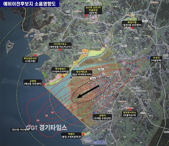 연구 결과 화홍지구 활주로에서 6㎞가량 떨어진 매향리와 궁평항, 4㎞ 떨어진 에코 팜 랜드, 서신면과 마도면 모두 75웨클 이상의 소음영향권에서 벗어났다고 발표했다.