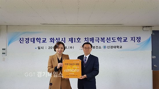 [경기타임스]화성시보건소는 신경대학교를 ‘제1호 치매극복선도대학’으로 지정 18일 현판식을 가졌다고 밝혔다.