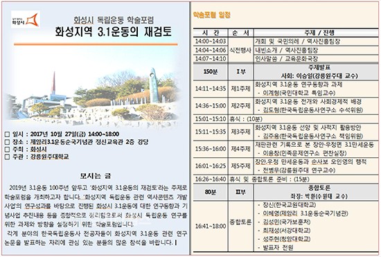 [경기타임스] 화성시는 27일 오후 2시부터 제암리3.1운동순국기념관에서 화성지역의 3.1운동을 재조명 학술포럼을 개최한다고 26일 밝혔다.
