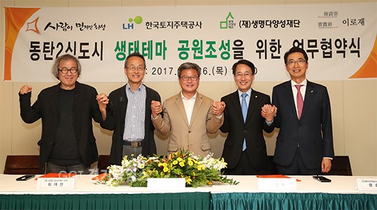 시는 26일 컨퍼런스하우스달개비(서울시 중구)에서 한국토지주택공사, 생명다양성재단(대표 최재천), 이로재(승효상건축)와 ‘동탄 2신도시 생태테마 공원 조성을 위한 업무협약(MOU)’을 체결했다.