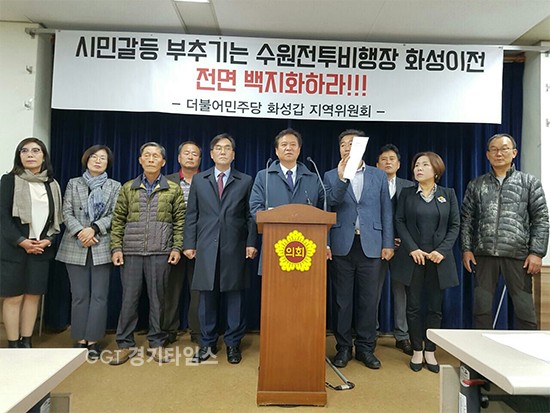 [경기타임스] 더불어민주당 화성갑 지역위원회(위원장 김용)와 이대휘 삼괴폐기물매립시설반대대책 위원장,장영호 서해선복선전철지하화추진위 위원장외 당원 및 화성시민 10여 명은 2일 오전 11시 경기도의회 브리핑룸에서 수원군공항 화성이전을 전면백지화 기자회견을 가졌다.